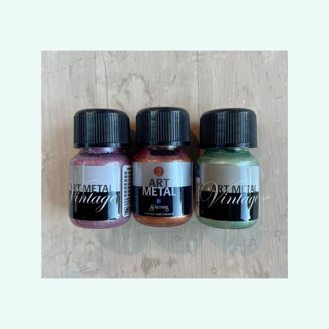 3 st metallfärg à 30 ml i färgerna pärlröd, koppar och pärlgrön