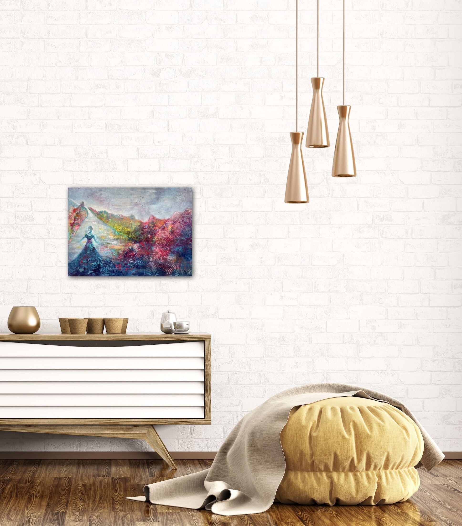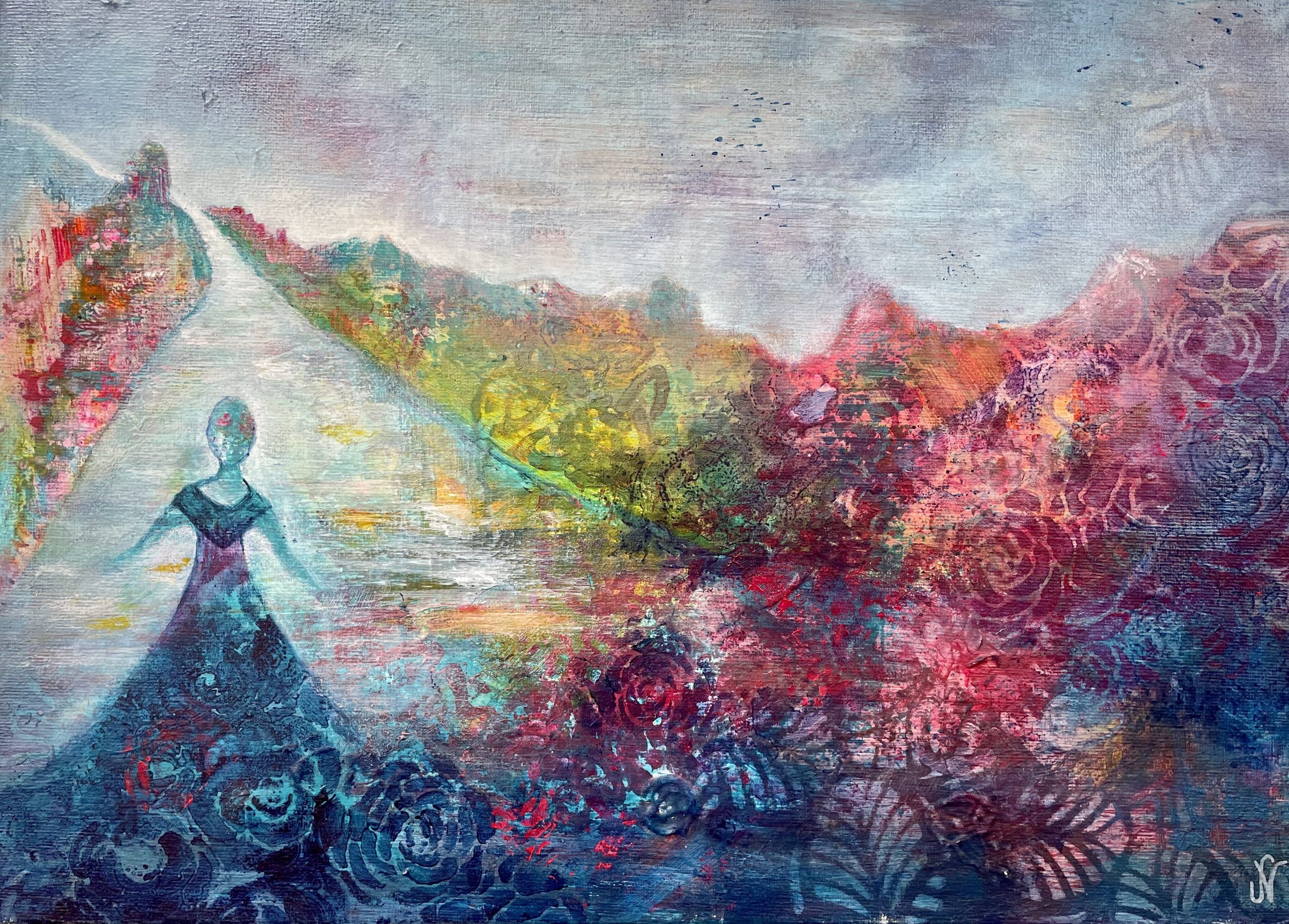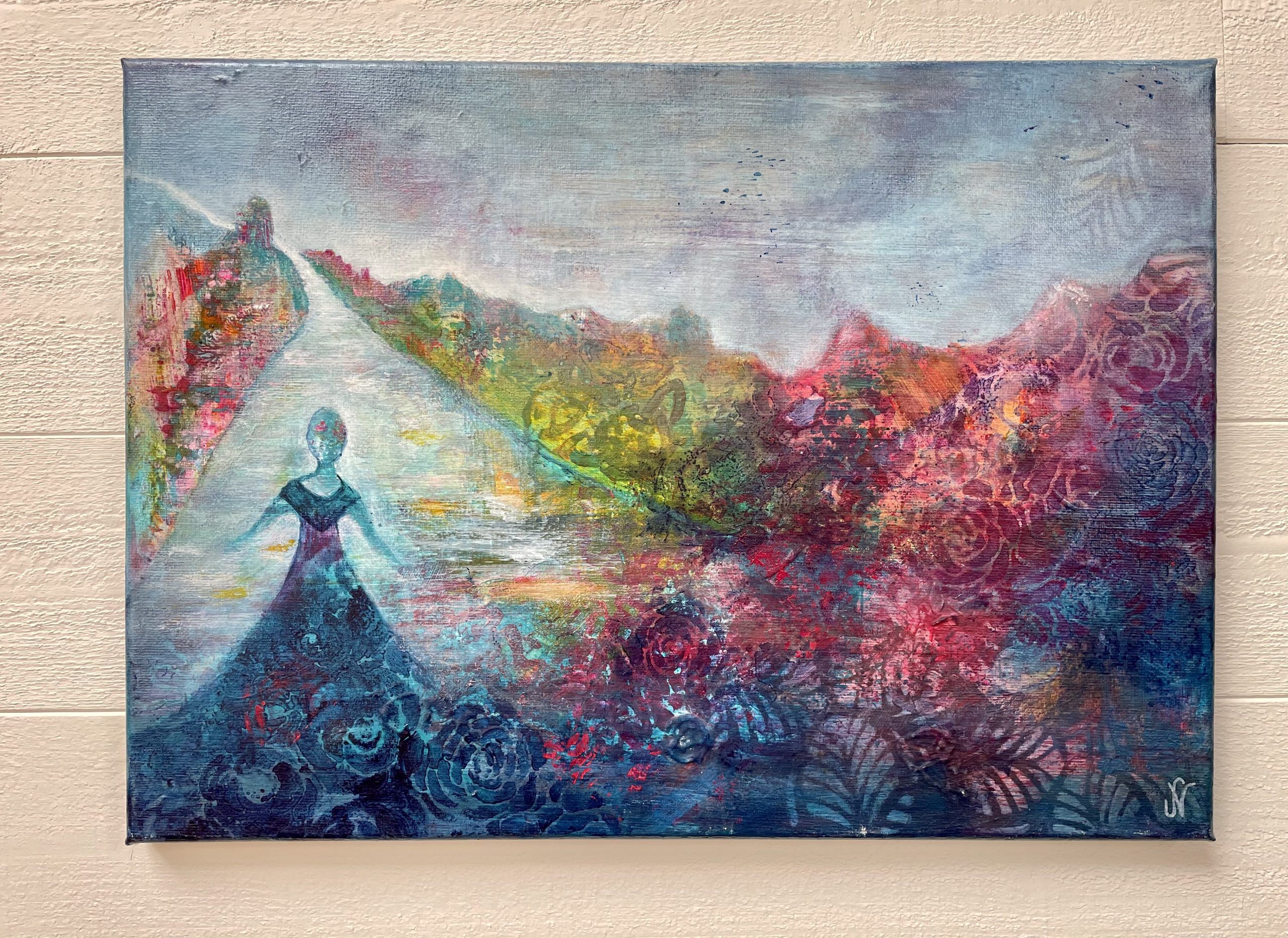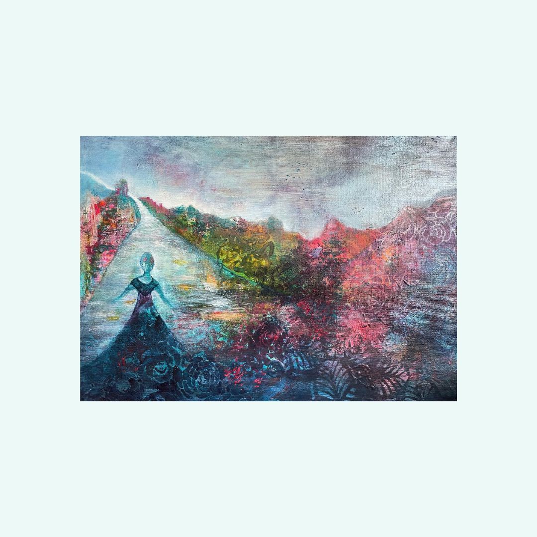 Process/material och storlek: Denna målning startade när jag skulle visa en ungdomsgrupp hur man startar en målning intuitivt. Blev först förälskad i delen uppe till vänster på målningen som på något sätt påminde mig om Grekland vilket förde tankarna till min resa till Grekland som 17 åring. Först kändes det som vatten men det visade sig vara en väg med en flicka! Kanske är det jag eller kanske är det du 🙂 Oavsett vem det är så ska vi lita på vår inre röst och vår magkänsla.