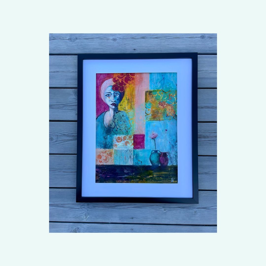 Process/material och storlek: En målning skapad med mixed media på 300 gr akvarellpapper i A3 format, 29,7 x 42 cm. Inramad i svart ram 42,5 x 52,5 cm med syrafri passepartout och utan glas. Jag har valt att ta bort glasskivan då jag tycker att man kommer närmre målningens själ utan glas.