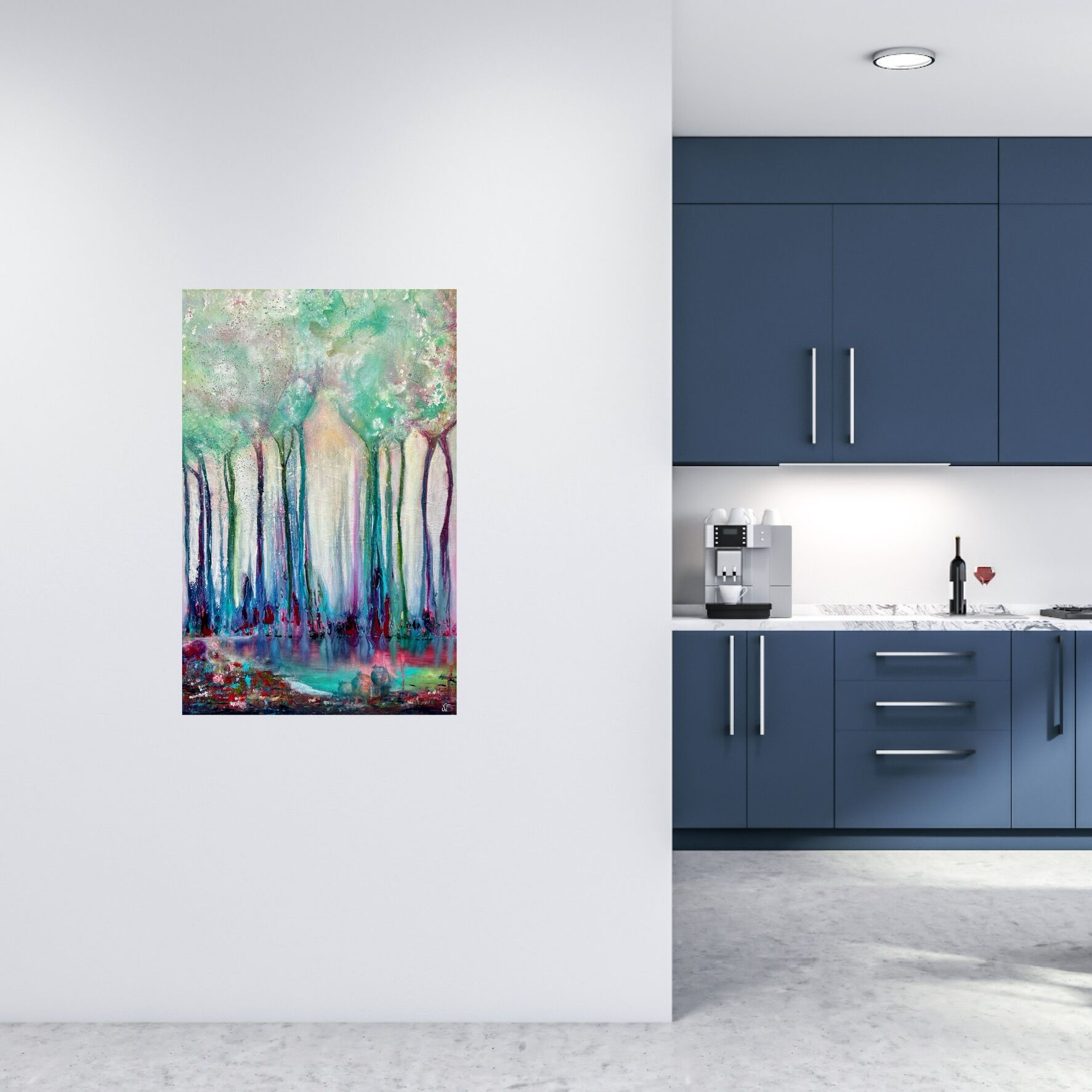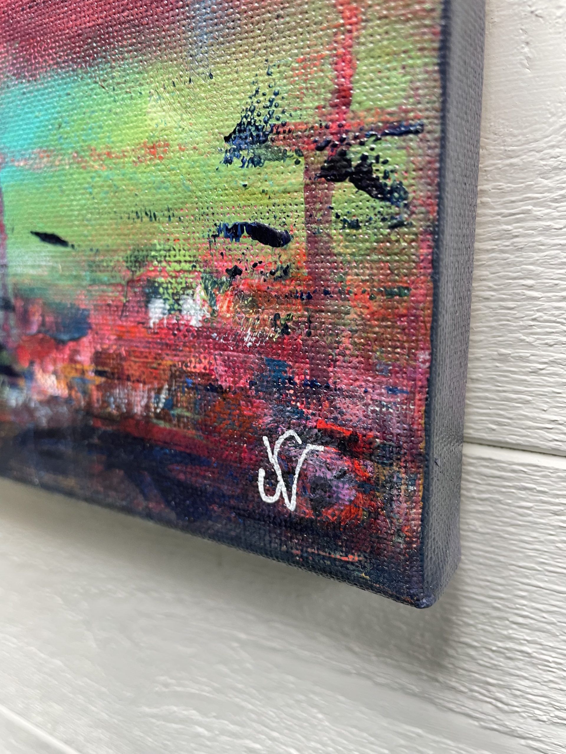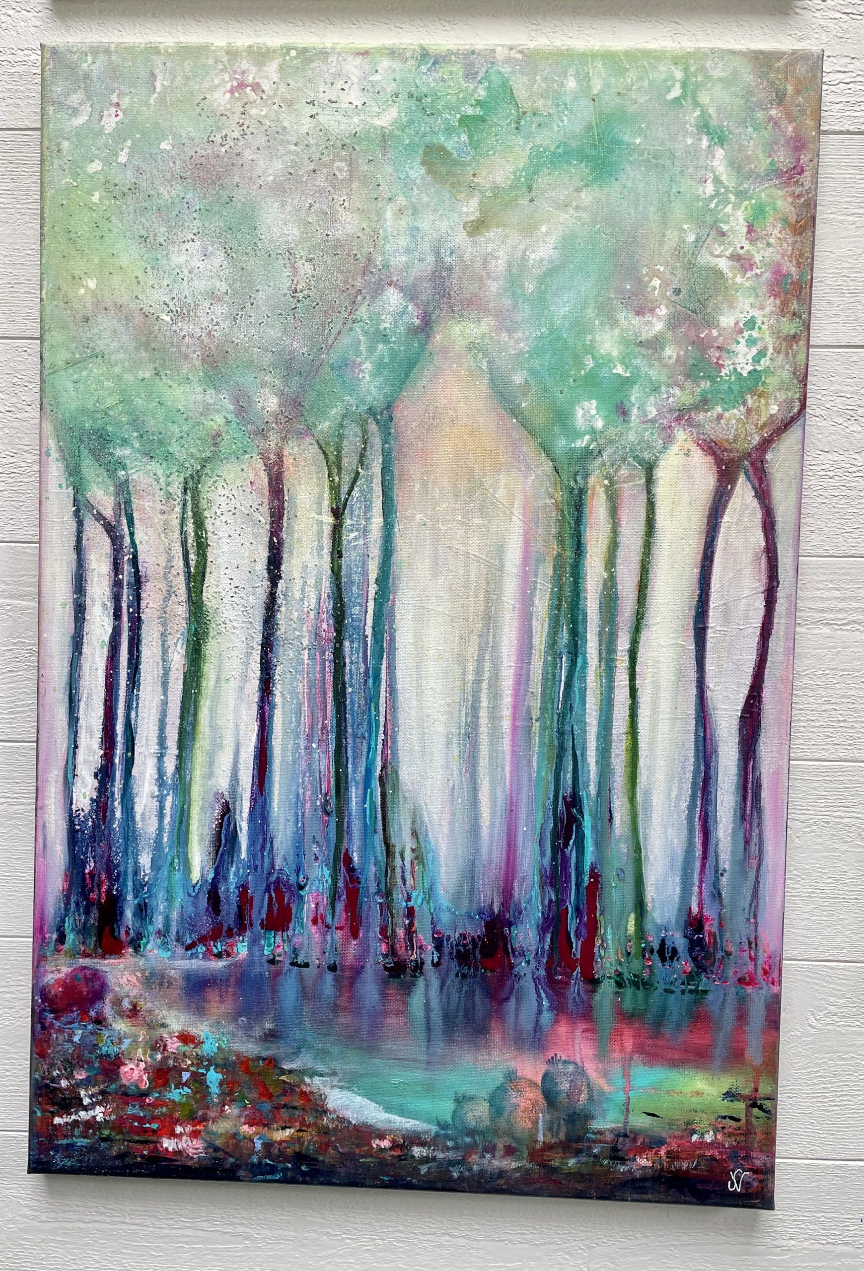 Process/material och storlek: I denna målarprocess fick jag jobba mycket med min egen inre stress. Målningen påminde mig om att sakta ner, andas, att ta en sak i taget och att i denna stillhet se det magiska runt omkring mig. Målad med akrylfärg på bomullscanvas 60×40,5×1,8 cm