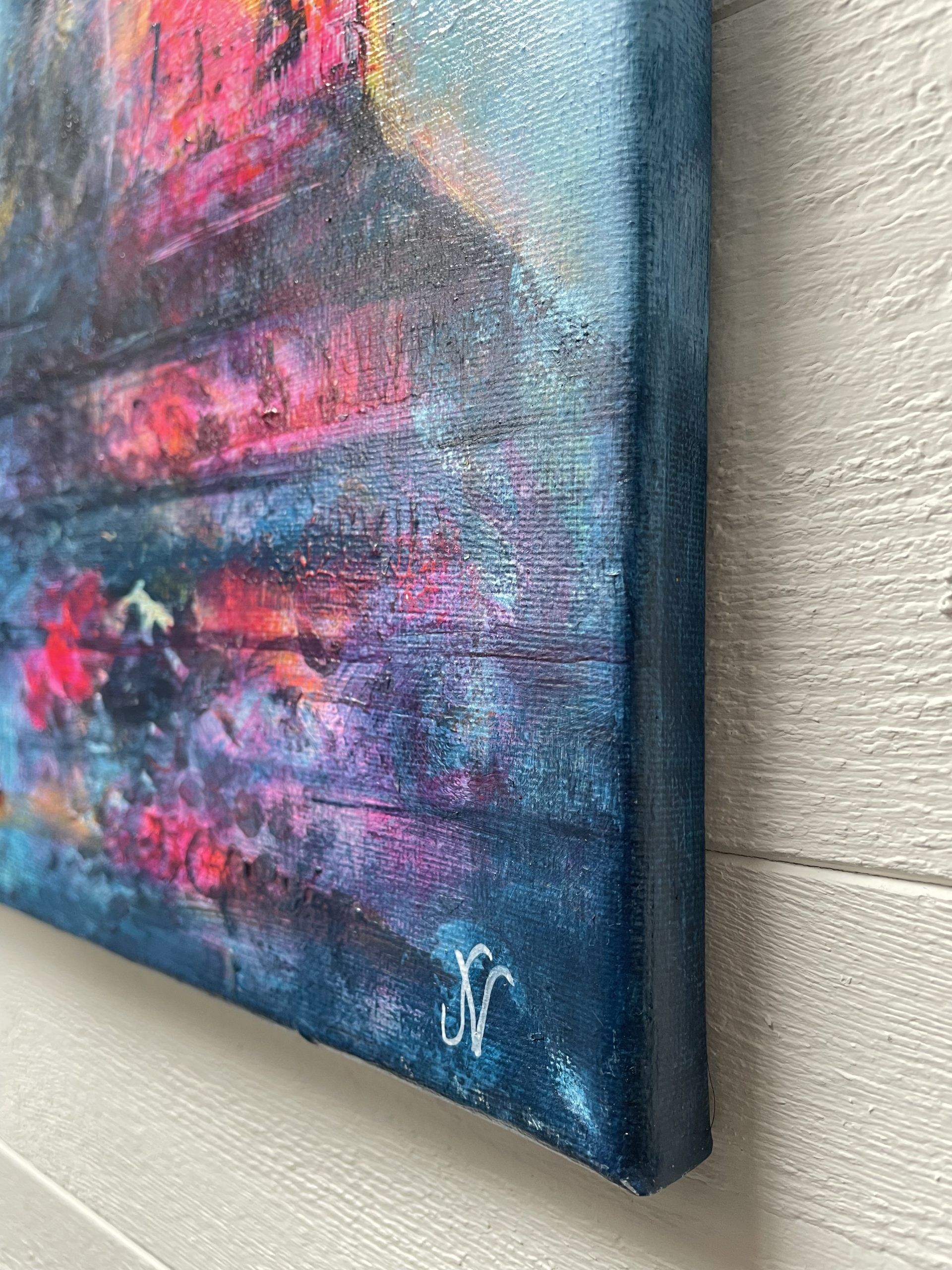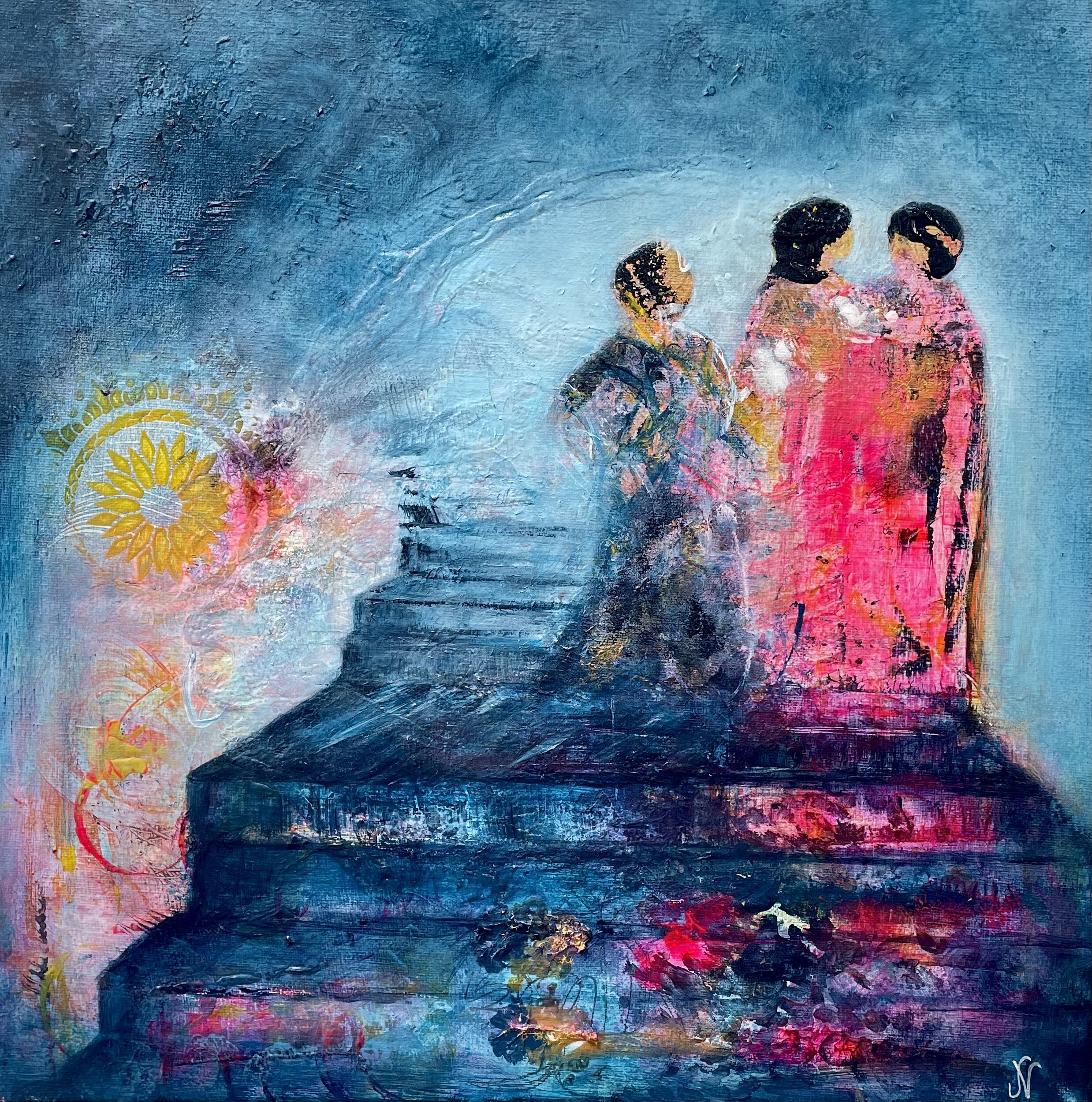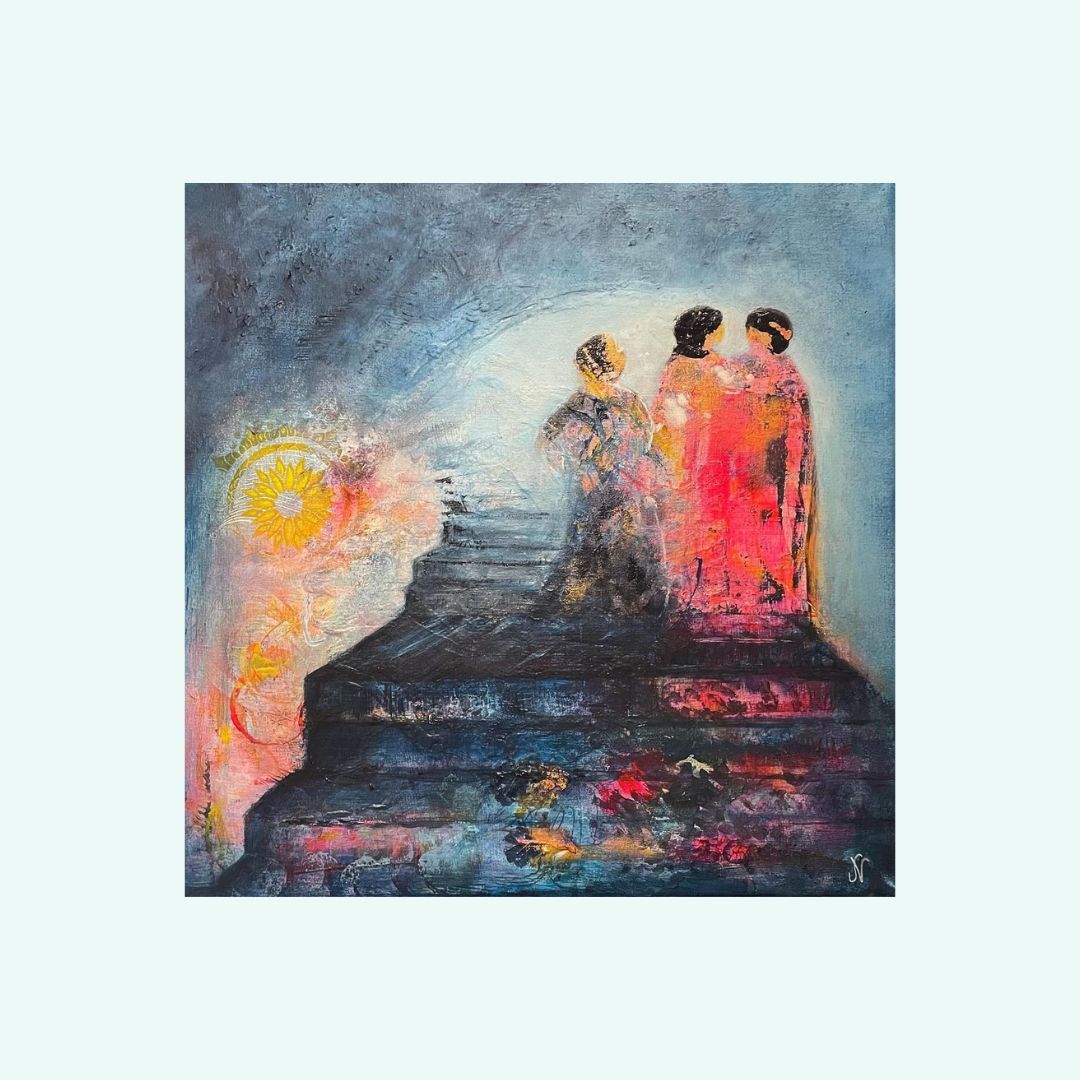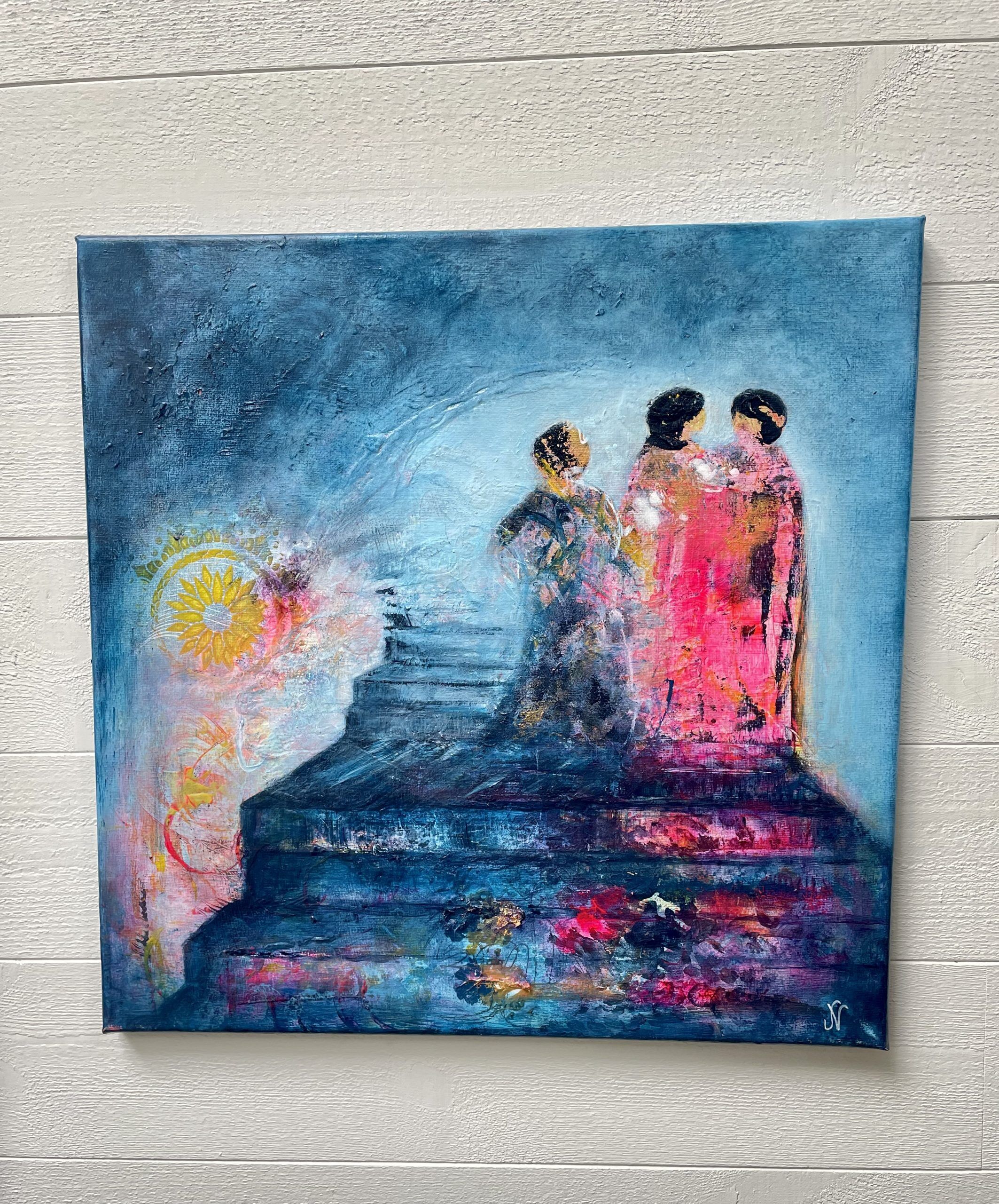Process/material och storlek: Denna målning startade jag upp i glädje över att få visa mina kursdeltagare hur jag startar en målning. Dessa kvinnor var så tydliga för mig på en gång efter min första lek. Det var aldrig någon tvekan att de var de viktigaste i målningen. De stod där så självklart på en trappa och deras kärlek och gemenskap känns så tydligt. Processen var tydlig och gick förhållandevis fort för att vara mig. Dock halade jag ut lite på tiden för att få umgås mer med denna målning så det blev många lager med samma färger på samma former vilket ger den extra liv! Målningen är målad på bomullscanvas och har måttet 40x40x1,8cm